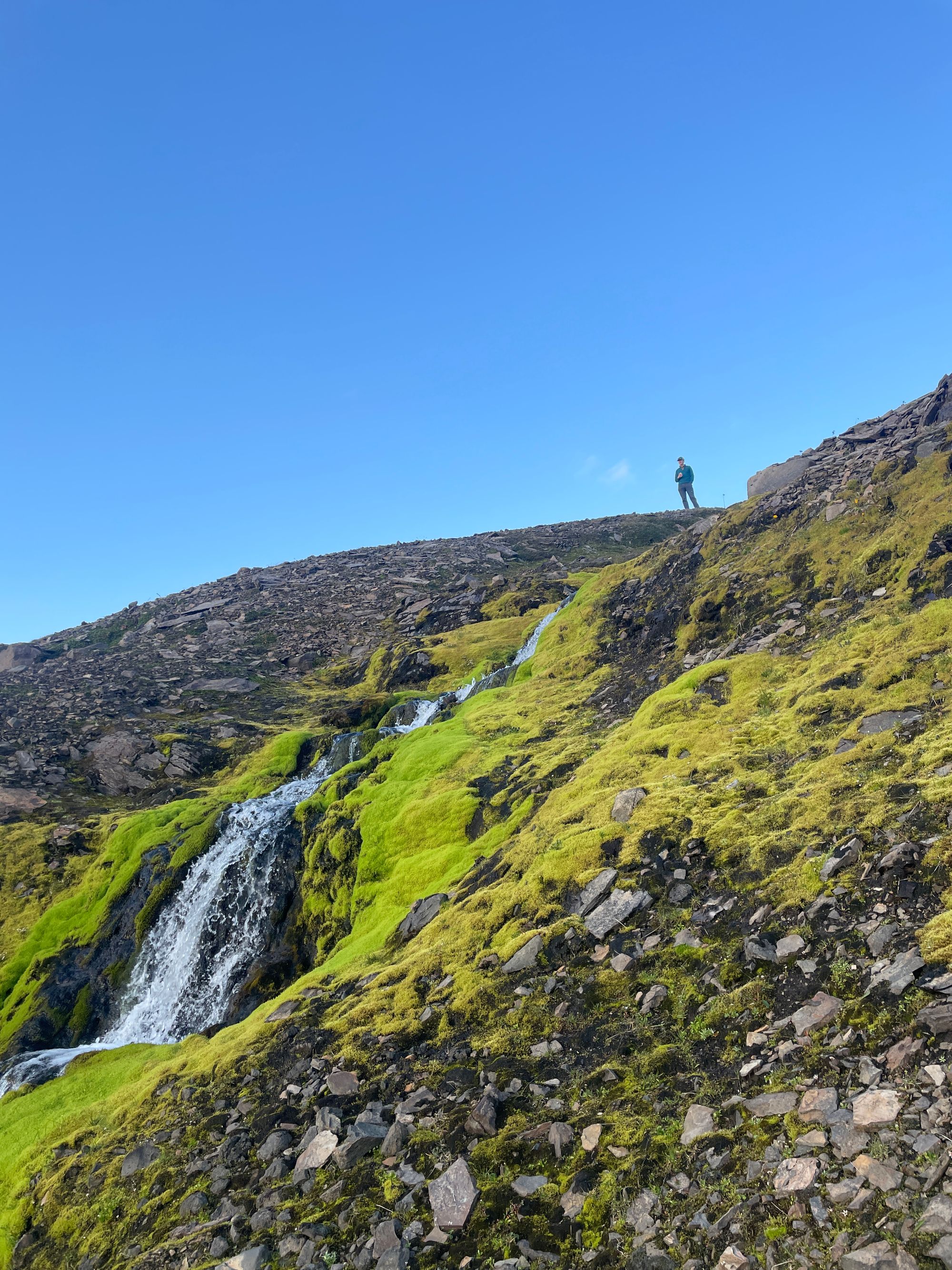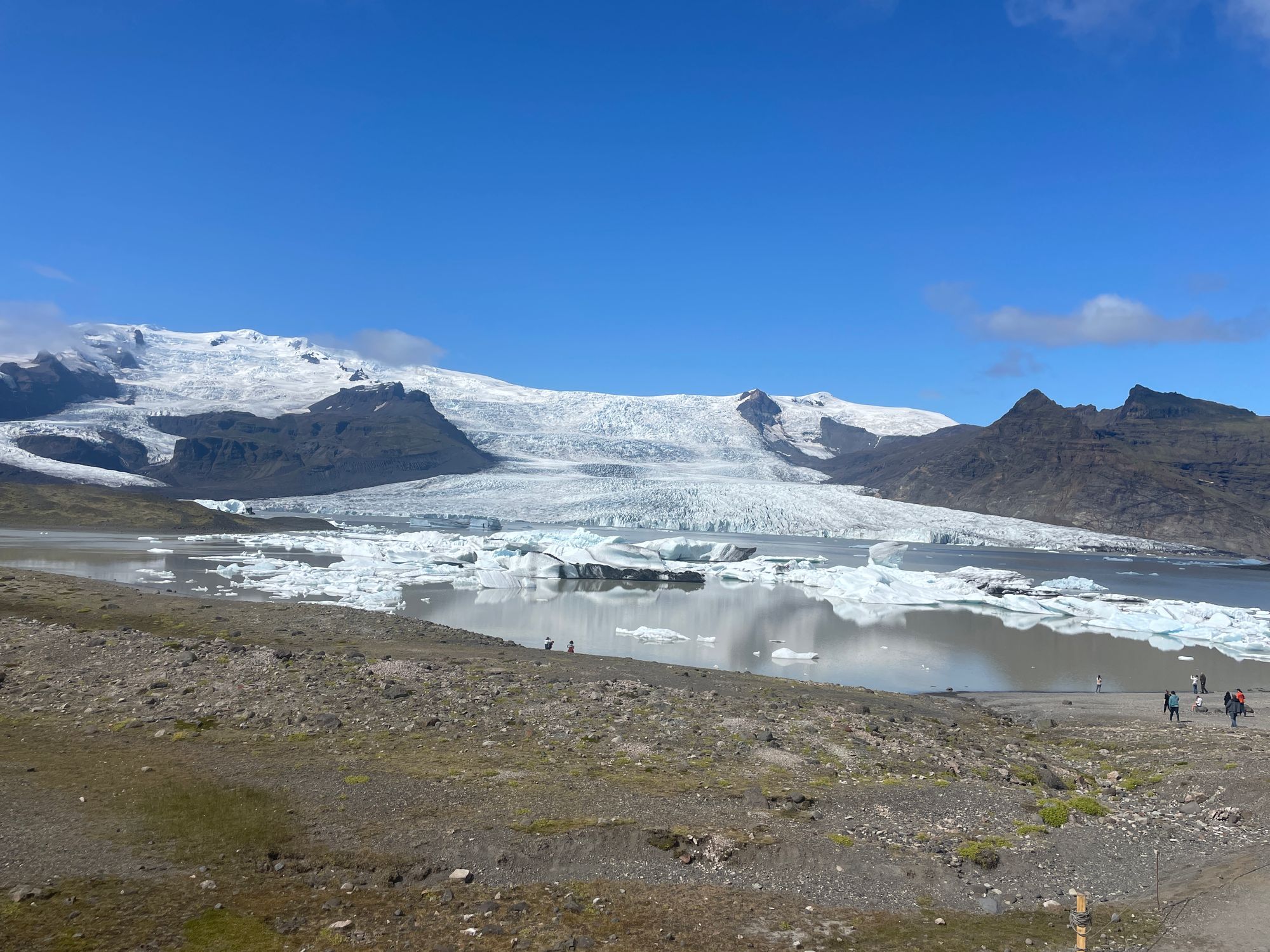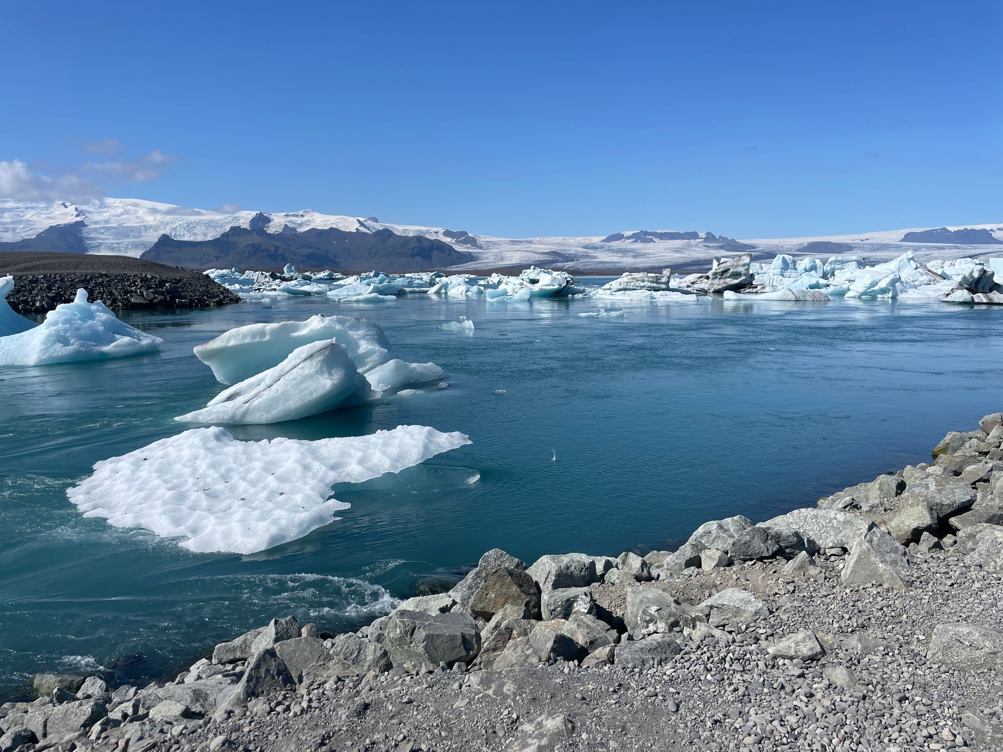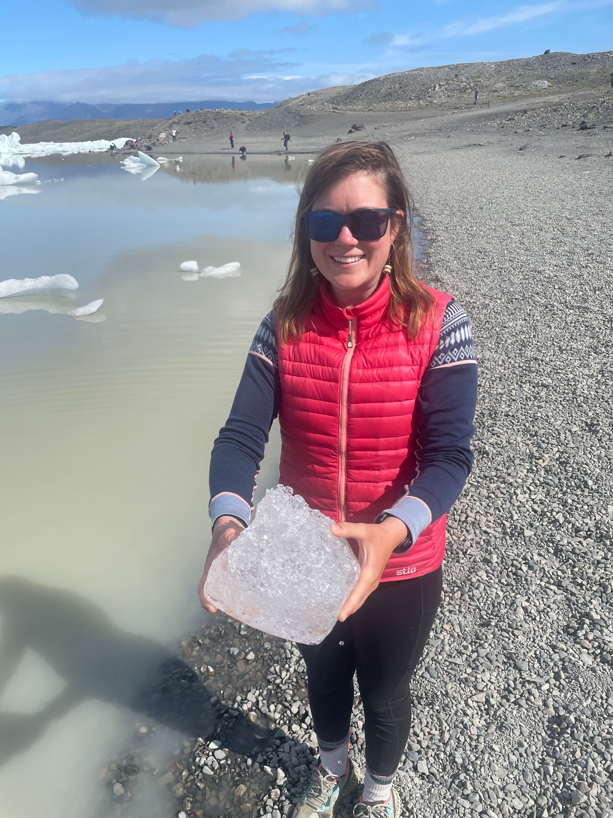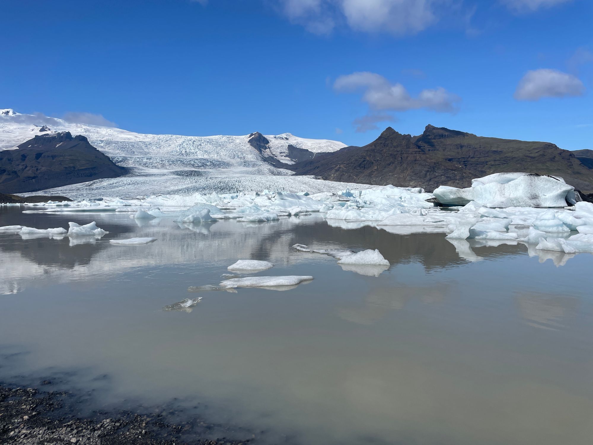 We didn’t get to touch it or go on it because it is sadly melting. The water that melts from the glacier runs underneath the glacier and veins out into a web of rivers, much like the effusive volcanos. Therefore, there were many small and large rivers of freezing water that prevented us from getting to the glacier itself. Furthermore, those little rivers or lakes (if the water aggregates on flat land with no outlet) have icebergs!